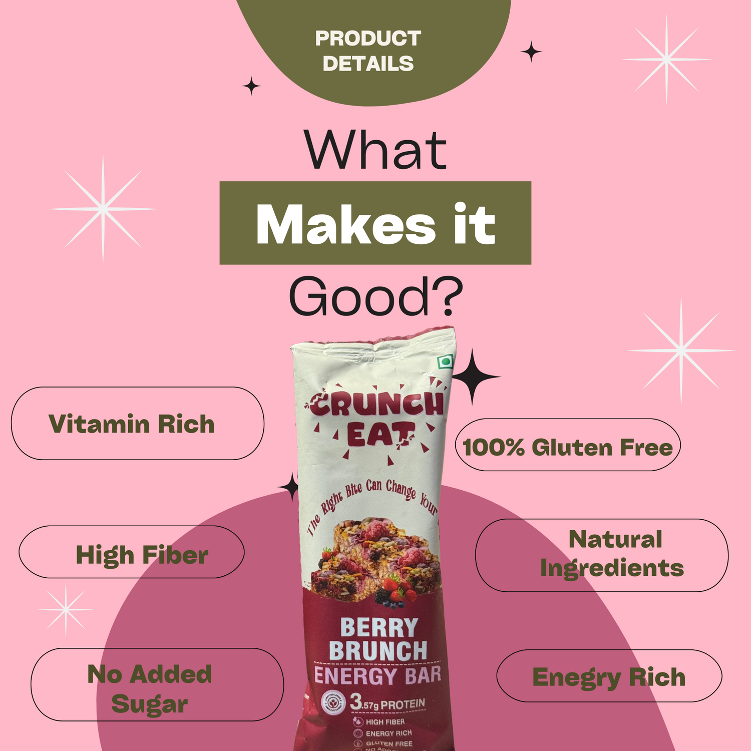 Berry Brunch Energy Bars are crafted with 100% natural plant-based ingredients like dates, roasted nuts, and oats, offering clean, sustained energy for up to 3 hours without any crash. Naturally sweetened with dates, they’re free from added sugar and preservatives, while being rich in fiber extracted from nuts and cereals to support gut health. With a delicious blend of chocolate and berries, it’s the perfect on-the-go snack that’s as nutritious as it is satisfying.